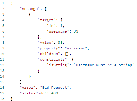 현재 경우 ValidationPipe로 검증을 하는 것이 아닌, Decorator에서 수동으로 검증을 진행하고 있기 때문에 결과가 조금 다를 수 있습니다.